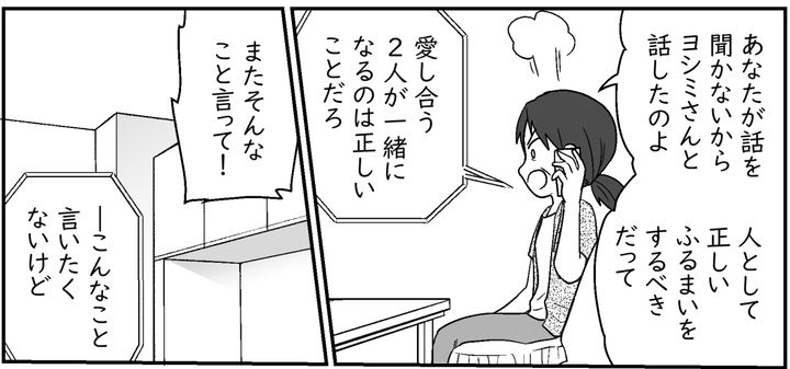 <義母の彼氏は30代!>「彼女を傷つけるなら絶縁」激怒する息子【まんが:彼氏母の気持ち】