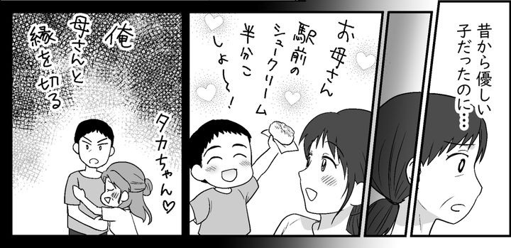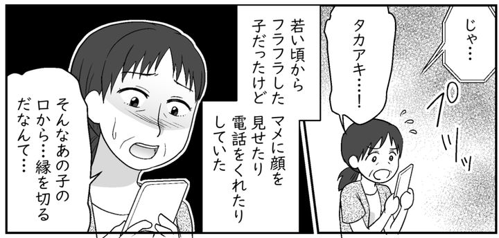 タカアキは若い頃からフラフラしていましたが、顔を見せたり電話をしたり、そういうことはマメにしてくれる子でした。親の様子を気にしてくれる優しい子なのです。まさか縁を切るだなんて……! ヨシミさんに対して、怒りがわいてきました。
