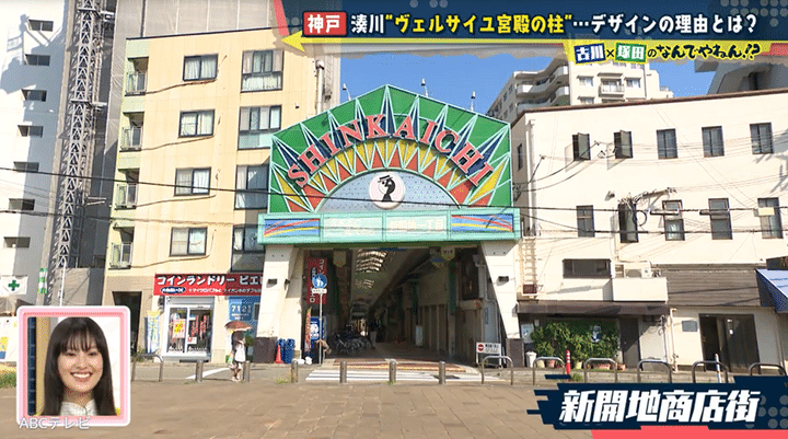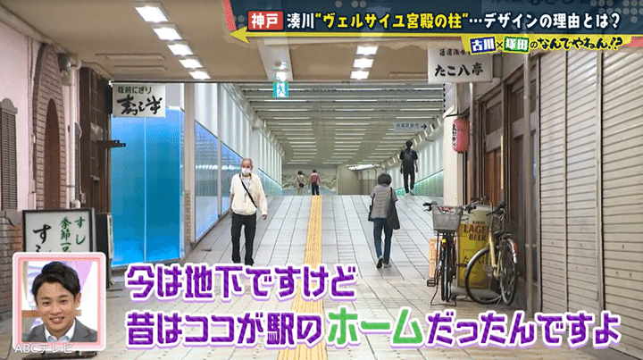 100年前の排水管のデザインが、“ヴェルサイユ宮殿の柱”風である理由を探るため、塚田と古川アナは湊川駅の構内へ。しばらく構内を調査した2人は、古川アナの提案で湊川駅のそばにある、新開地商店街へ向かった。
