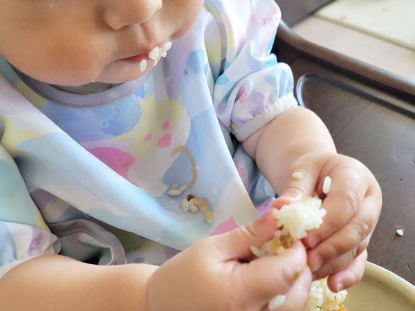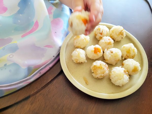 掴み食べをしたい1歳児は、喜び勇んでおにぎりをパクッ。そして、モグモグとしっかり噛んでいるのを目視…いつもは小さく刻んだ具材を丸飲み気味なのに!今日は長いこと噛んでいる。