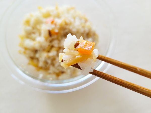 「混ぜごはんの素」は2種類。「もち麦と大根の野菜出汁ごはん」は、もち麦のプチプチ食感で噛む力を育み、食物繊維も豊富。「ひじきと鶏の和風出汁ごはん」は、和風食材をバランスよく使いカルシウムもチャージ。今回は、「もち麦と大根の野菜出汁ごはん」を試してみました。