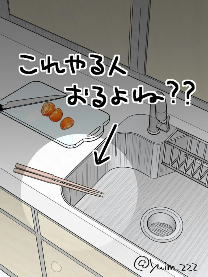 投稿に描かれていたのは、シンクのふちに置かれたお箸です。誰しもやったことがあるのではないでしょうか。または、やろうと思ったことがあるのでは。不思議と、シンクのふちのところがお箸を置きたくなる形状をしているのです。育児や家事、仕事に追われる毎日で、ついつい完璧なものを求めてしまいがちですが、時には手を抜くことも大事です。