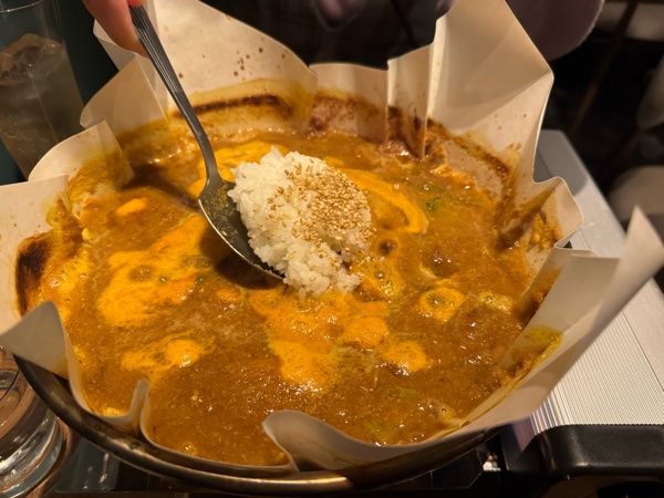 名物の「元祖紙やき」は、創業者・櫻井道夫氏が開発した秘伝のベジナッツスープでラム肉を煮込む独自の調理法。たっぷりの野菜や果物、ナッツを使ったスープは、ラム肉のクセを抑えつつ、深いコクと旨みを引き出します。
