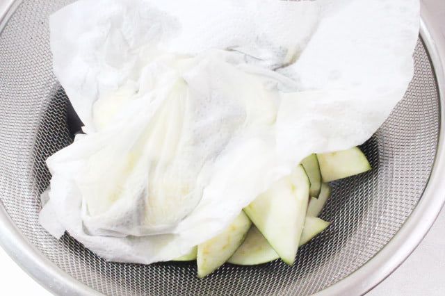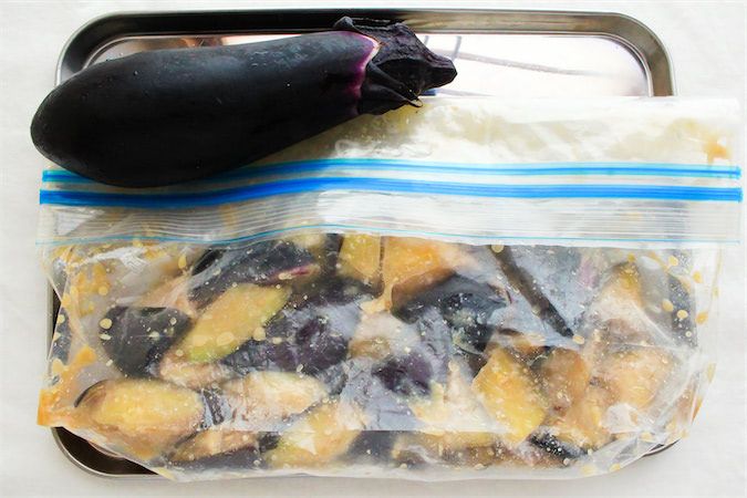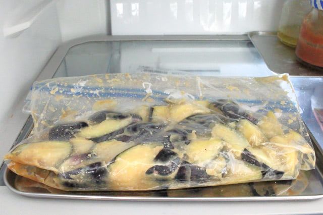 乱切りのなすがゴロゴロとしているので、全体に漬けだれが絡まるように、2分ほど揉みました。