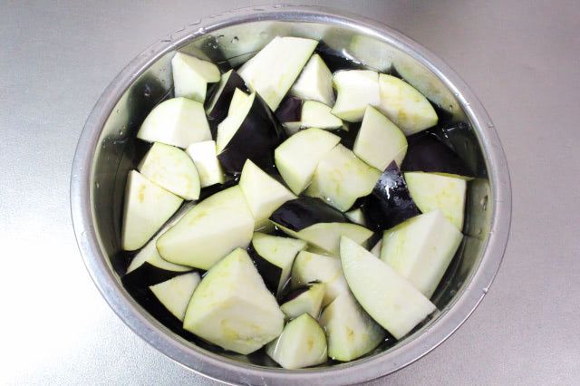 1. へたを切り落としたなすを縦半分に切って、乱切りに。水(分量外)に10分さらして、アク抜きをします。