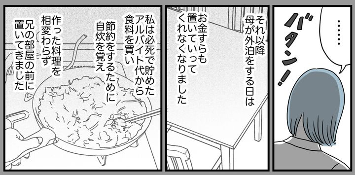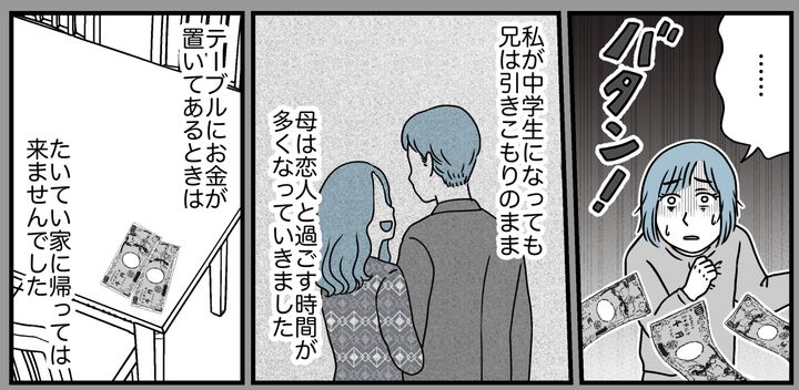 兄はたまに家のなかですれ違うと、やたらと私を敵視してきます。けれど私は一切相手にはしませんでした。たまに近所の叔母が様子を見に来てくれましたが、叔母はまさか母が子どもを置いて外泊しているなんて思ってもいません。