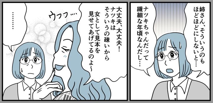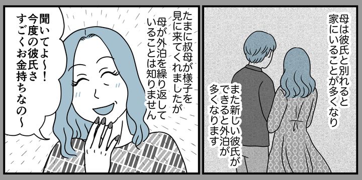 その頃になると、私はもはや「母親」と暮らしているというよりも、「親」という肩書きを持った男好きの女性と同居をしている……という程度に思うようになりました。叔母はまさか母が私たちを置いて外泊を繰り返しているとは露知らず。私ももはや諦めの境地に達していたので、あえて叔母には何も話しませんでした。母に期待しては裏切られていた頃よりも、ずっと気が楽になっていたのは事実です。