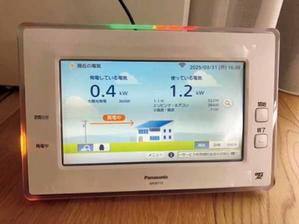 家を購入した際に太陽光パネルを設置。「職業柄もあり電気の使用量が気になって、発電状況や電気の使用量がわかるモニターを事あるごとに見て、無駄な電気の使用をチェックしています。電力の使用量が多いエコキュートは、本体の使用時間を夜中から太陽光で発電している時間帯に変更して、お湯を沸かすようにしています」