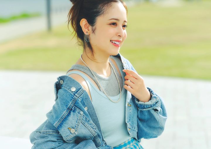 タンクトップ[水色]¥2,970/CITEN(ユナイテッドアローズ カスタマーサービスデスク) タンクトップ[グレー]¥6,600/スローブ イエナ(スローブイエナ 自由が丘店) ジャケット¥51,700/エー・ゴールド・イー(シチズンズ・オブ・ヒューマニティ) スカート¥25,300/アルページュストーリー イヤリング¥31,900/ete ネックレス¥41,580/アルポ(ズットホリック) バッグ¥12,900/CHARLES&KEITH JAPAN