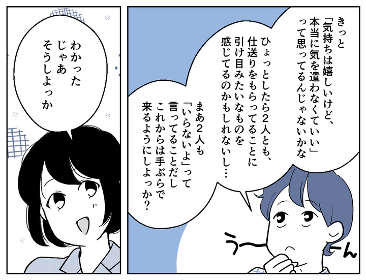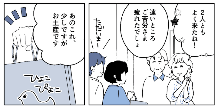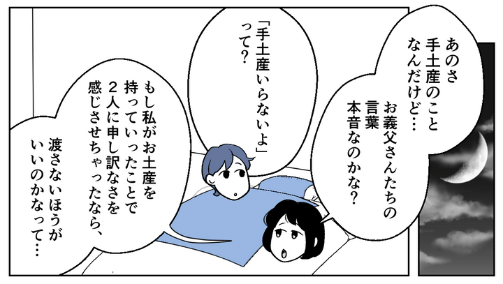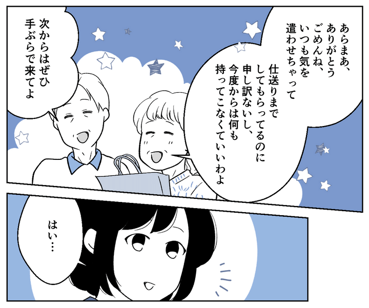 帰省時に手土産を渡すと義母は恐縮し、「仕送りももらっているし、今後は手ぶらで」と言われました。夜にタカフミに相談すると、「気を遣わなくていいという意味だろう」となり、今後私たちは手ぶらで帰省することになったのです。