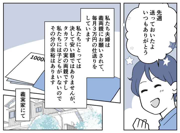 タカフミの両親への仕送りは毎月3万円。決して安い金額ではありませんが、義両親の感謝もあり継続していました。