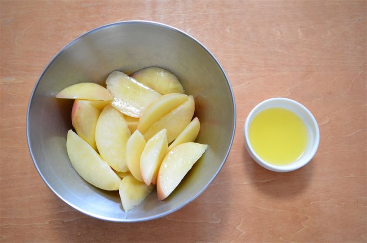 レモン汁をかけて桃の変色を防ぎましょう。皮は捨てないでくださいね!