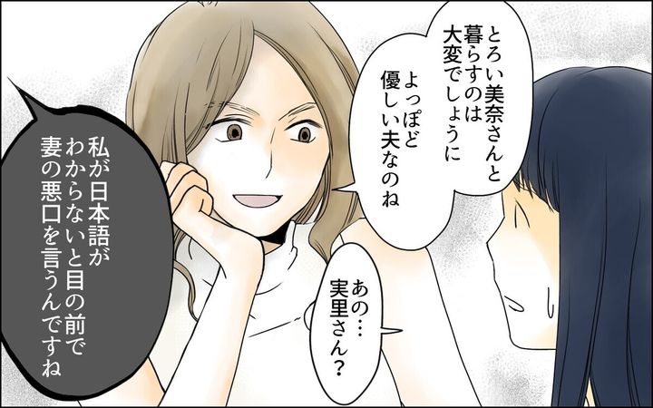 ダニエルと国際結婚をして幸せな日を送る美奈の元に同窓会の招待状が届きました。夫の勧めもあって参加した美奈でしたが、そこには当時美奈をいつもからかっていた実里の姿が…。