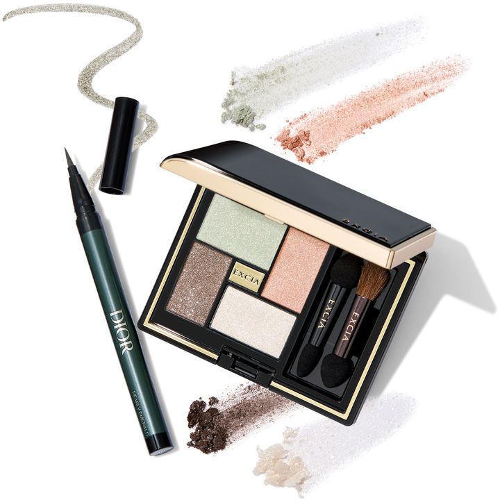 左:描きやすいフェルトチップで、どんなラインも自由自在。皮脂・汗・涙・こすれに強く、にじみにくい。深みのあるカーキ色でトレンド感も加速。DIOR ディオールショウ リキッド ライナー ウォータープルーフ386 パーリー エメラルド ¥4,840(パルファン・クリスチャン・ディオール)右:重ねても濁らず透明感が増す発色。くすみがちな目元を軽やかに見せるグリーンとクリアカラーの4色パレットは、骨格を自然に際立たせながら、目元の鮮度を引き上げます。EXCIA アイカラー ヴォロンテ 04 プリュム ドゥース ¥6,600(アルビオン)