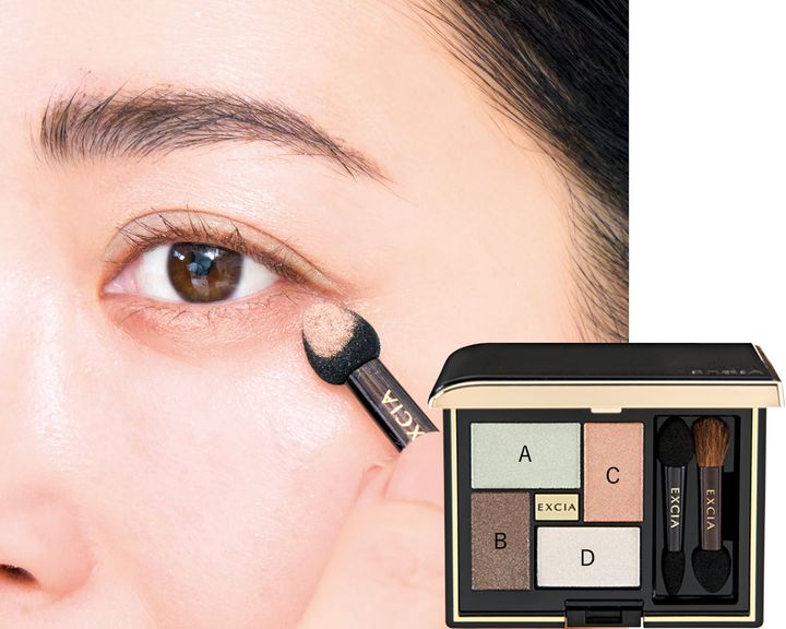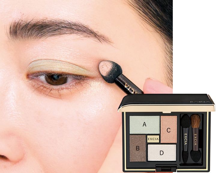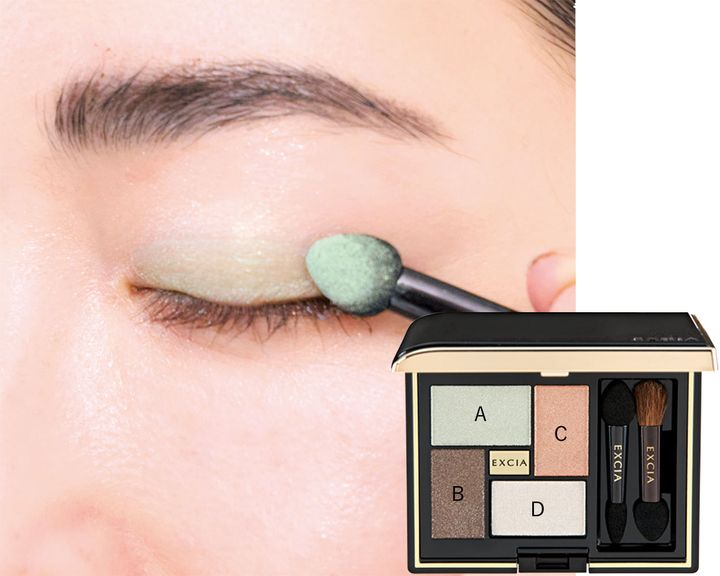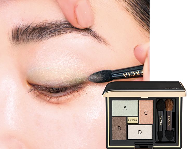 ❶Aのグリーンをチップに取り二重幅からアイホールに広げてぼかします。❷次にCのベージュをチップに取り、最初に入れたグリーンの境目のアイホールからまぶた全体に広げ馴染ませます。❸さらに、下まぶたの目尻から1/3程度にも入れ、涙袋に広げます。パステルグリーンもベージュと馴染ませることで、さりげなく骨格が際立ち立体的に見えます。❹次にBのグレーを細チップに取り、目の際にシャドウラインのように細く入れます。❺最後に、Dのハイライトカラーをブラシに取り、目頭にちょんと置き、眉下にもさっと入れぼかします。エクシア アイカラー ヴォロンテ 04 プリュム ドゥース ¥6,600(アルビオン)