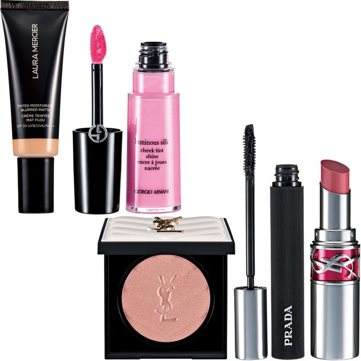 上段左から:肌の潤いもキープして悩みもカバーする薄膜ファンデ。ローラ メルシエ ティンティド モイスチャライザー ブラード マット 1N 45ml SPF30・PA +++ ¥6,820(ローラ メルシエ ジャパ ン)ピンクチークを頰骨の高い位置に入れます。ルミナス シルク チーク ティント シャイン 53S コズミック ピンク ¥6,600 ※7/4発売(アルマーニ ビ ューティ)繊細な光のチークを纏わせてW使いで肌と一体化させます。オール アワーズ ハイパールミナイザー 03 ロージー サンド ¥9,350(イヴ・サンロ ーラン・ボーテ)黒のマスカラで繊細に仕上げ、目元にさりげない存在感を。PRADA スコープ ラッシュ エクステンディング ボリューム マスカラ 01 Nero ¥6,380(プラダ ビューティ)上品なミルキーピンクのリップでヘルシーさを生かして。YSL ラブシャイン キャンディグレーズ 44 ヌード ラヴァリエール ¥5,940(イヴ・サンローラン・ボーテ)