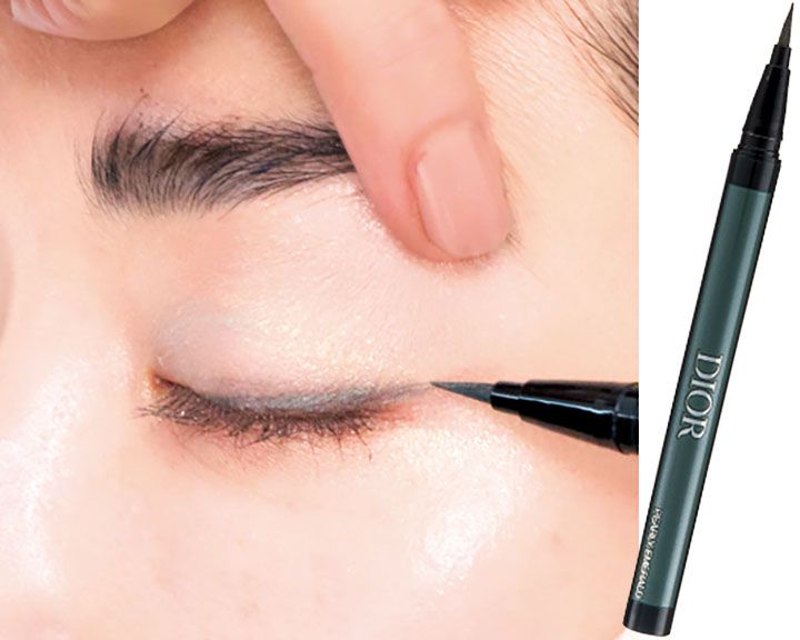 黒だと締めすぎて少し重たく感じるので、カーキ色をセレクト。グレーのシャドウラインを入れた、目の際に引きます。目尻は少し長めに平行に入れて。グレーシャドウと調和させることで抜け感ある大人の目元に仕上がります。ディオールショウ リキッド ライナー ウォータープルーフ 386 パーリー エメラルド ¥4,840(パルファン・クリスチャン・ディオール)