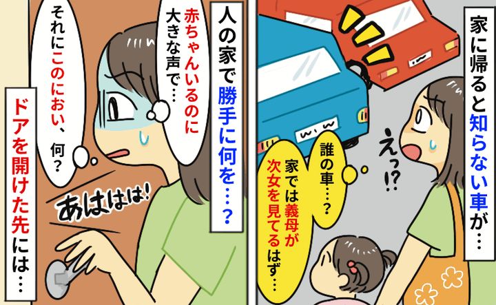 義母に0歳の娘を預けて外出すると「知らない車が家に!?」賑やかな声と何かのニオイ…扉の向こうには