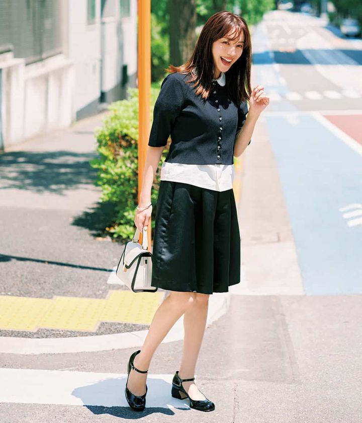 子どものお稽古送迎では、先生にご挨拶するので〝ほぼクロ〟コーデできちんと感を意識するように。適度にカジュアル感を足せるハーフパンツなら、待ち時間のカフェや仕事の打合わせにも軽やかに対応。(小泉春香 43歳・本誌ライター)