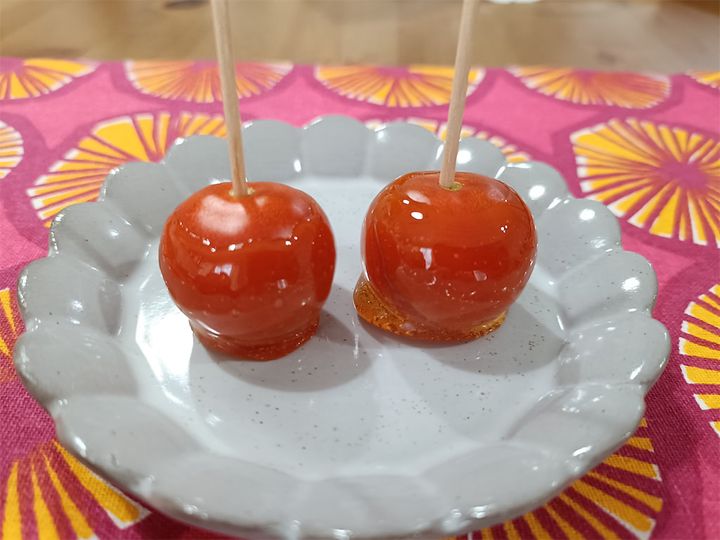 ミニトマト2個バージョンに飴を絡めるのが難しかったので、1個バージョンで再挑戦!