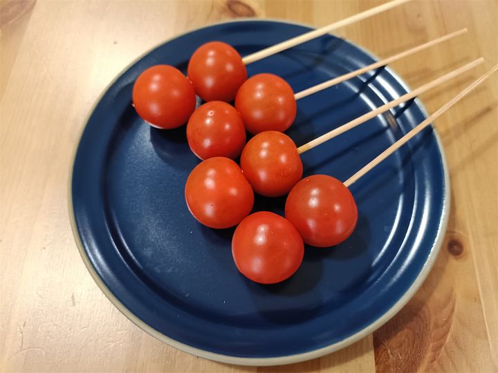 1. ミニトマトを2個ずつ竹串に刺します(皮つきのままでOK)。