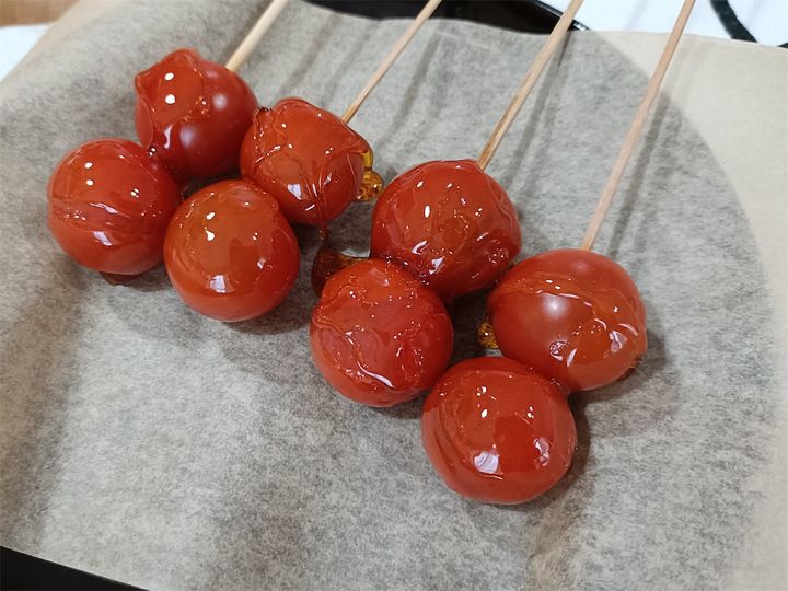 パリパリの飴をかじってみると…うん、ミニトマトがプチっとはじけてとてもジューシー!
