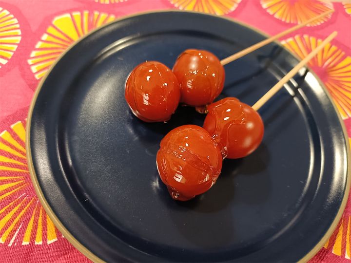 わが家では、もっぱらお弁当の彩りとして出番の多いミニトマト。ですが、愛媛県の農家に教わったレシピは想像の斜め上すぎる…。串に刺したミニトマトにまんべんなく飴を掛けて、まさかのスイーツにするんですって。どこか見覚えのあるこのフォルム…そうだ、縁日でお馴染みのりんご飴(のちっちゃいバージョン)だっ!飴はレンチン調理でOKらしいので、自宅で夏気分を満喫いたしま~す♪