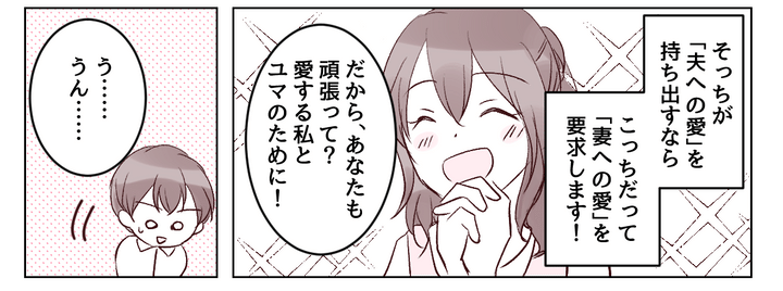 いずれ私も仕事復帰するから、いつまでも甘えられても困ります。そっちが「夫への愛」を持ち出すなら、こっちだって「妻への愛」を要求します! 今後もお互いに「愛」を忘れないようにしながら、夫婦で頑張っていきたいと思います。