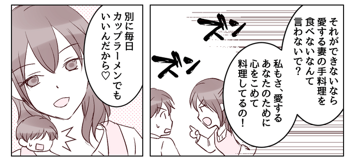 私はアイ。夫のダイキと結婚して、娘のユマを育てています。出産前は夫の「これが食べたい」というリクエストに応じて夕飯を用意していた私。ユマが生まれてからはそこまで手が回りませんでした。しかし生後半年経ったある日、夫のリクエストが復活。しかも食べたいものをコロコロ変え、「愛する夫のためにそのくらい頑張って」と言うのです! 姉によると夫のワガママは「ボクのお世話もしてよ」という甘えではないかと言うのですが……。