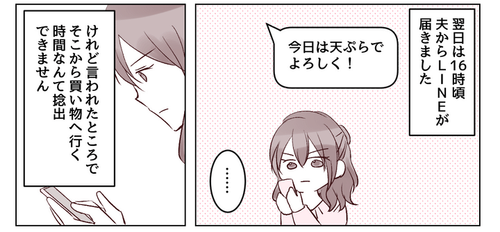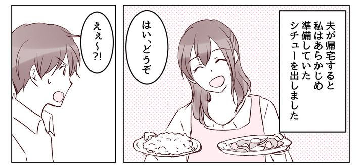 夫が帰宅すると、私は当たり前のようにシチューを出しました。夫はてっきり私が必死でリクエストに応えようとするものと思っていたのでしょう。「えぇ~!? 天ぷらって言ったじゃーん?」と不服そうにほっぺを膨らませてスネます。