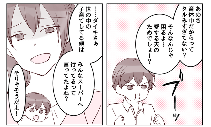 夫が「世の中の子育てしている親は」という言い方をするので、私も「あなただって子育てしている親でしょ」という言い方をしてやりました。姉の言うとおり、私が無理してリクエストに応えてあげたのがよくなかったのかもしれません。私がキッパリした態度を示すと、さすがに夫はたじろいでいました。
