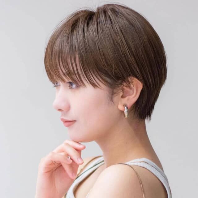 品よく見せたいなら、前髪を深めに流すサイドパートショートがおすすめ。斜めに入るラインがフェイスラインを引き締め、陰影によって自然と小顔効果を発揮します。