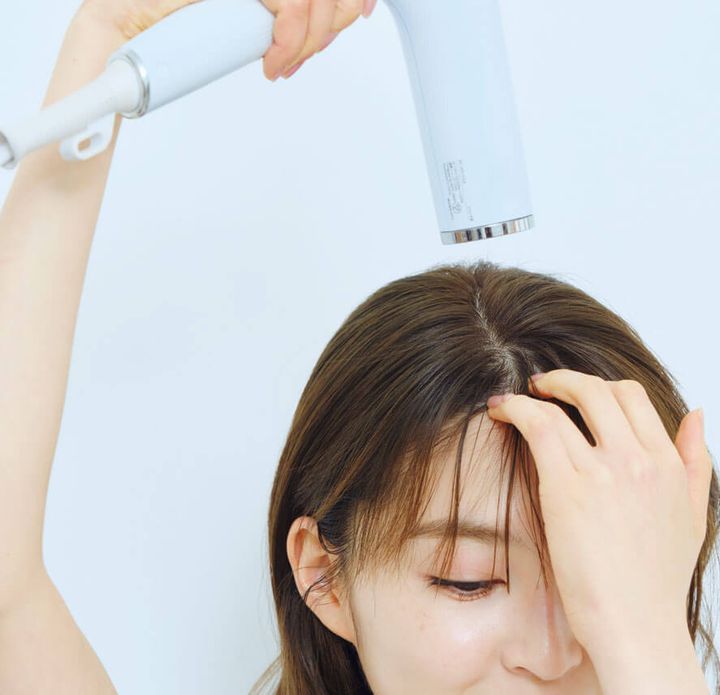 クセがあるままヘアセットすると崩れやすいので、面倒でも寝グセなどは一旦リセットしましょう。霧吹きなどで指を濡らし、毛先だけでなく、根元からクセをとっていく。