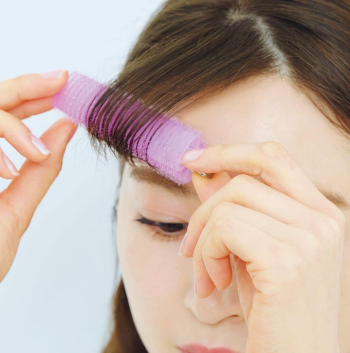 前髪にカーラーをしながらメイクや朝の支度などして10分以上たったら、クリップを広げて、流したい方向に斜めに外す。アイロンよりも自然で緩やかな丸みがつきます。