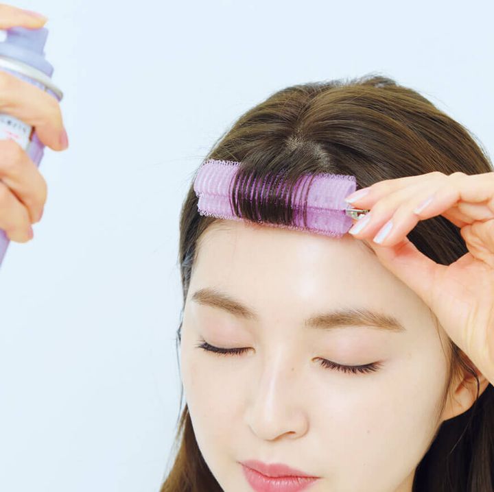 前髪の毛先をカーラーで挟んだら、くるくる内巻きにして表面にスプレーをする。このとき、根元の毛が立ち上がりすぎないよう角度に気をつけて。クリップ式ではないカーラーでもOK。
