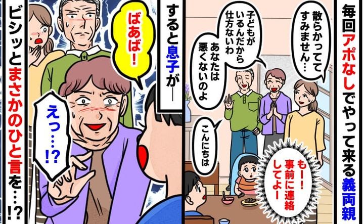 「散らかっててすみません…」毎回アポなしでやって来る義父母に困惑している私…すると息子がビシッと!?