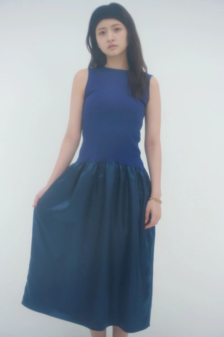 ブルーとネイビーのグラデでクールに。ピタピタと、サテン部分のボリュームでコーデ全体に女みを取り入れて。