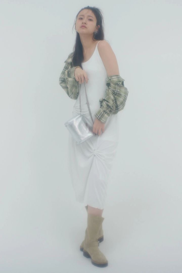 キャミワンピース 15,400円/アスラ、シャツ 13,530円/ノットユアローズ(ともにHANA KOREA)バッグ 48,620円/ミニットミュート(HANA SHOWROOM)イヤリング 13,860円/somnium ブーツ 25,300円/ルタロン(ル タロン 有楽町マルイ店)
