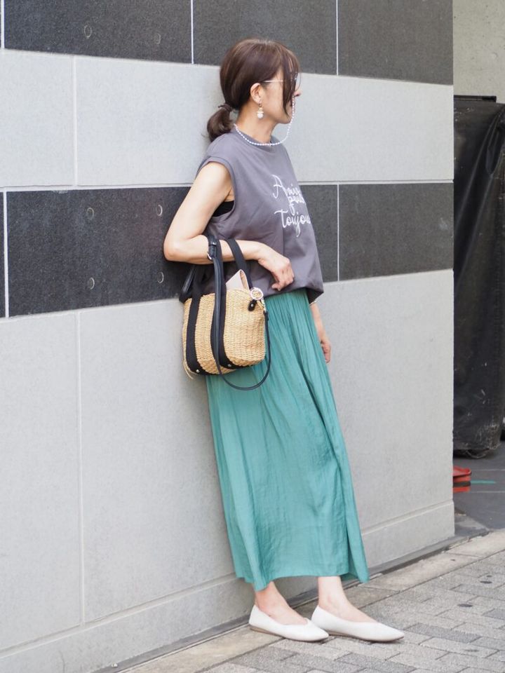 「カジュアルになりがちなロゴTシャツは、色やシルエットなどを吟味して選ぶようにしています」とさおりさん。チャコールグレーに白文字の刺しゅうという清潔感のあるデザインが◎。ネックラインの開きが絶妙で、きれいめなスタイリングにも合わせやすいアイテムなのだとか。とろみ素材のグリーンのスカートと合わせることで、ぐっとこなれた印象に。