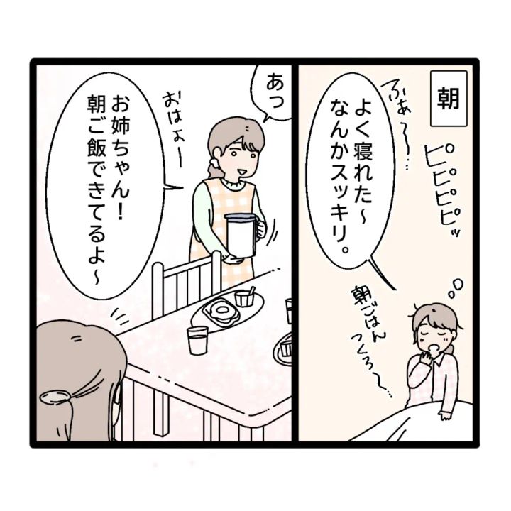 「ふぁ~・・よく眠れた~!なんかスッキリ!朝ごはんつくろ~」と目覚めの良い朝を迎え朝食を作ることに。そして、お姉ちゃんが起きて来た頃、「あっ、おはよー。お姉ちゃん!朝ごはんできてるよ~」と声をかけると、