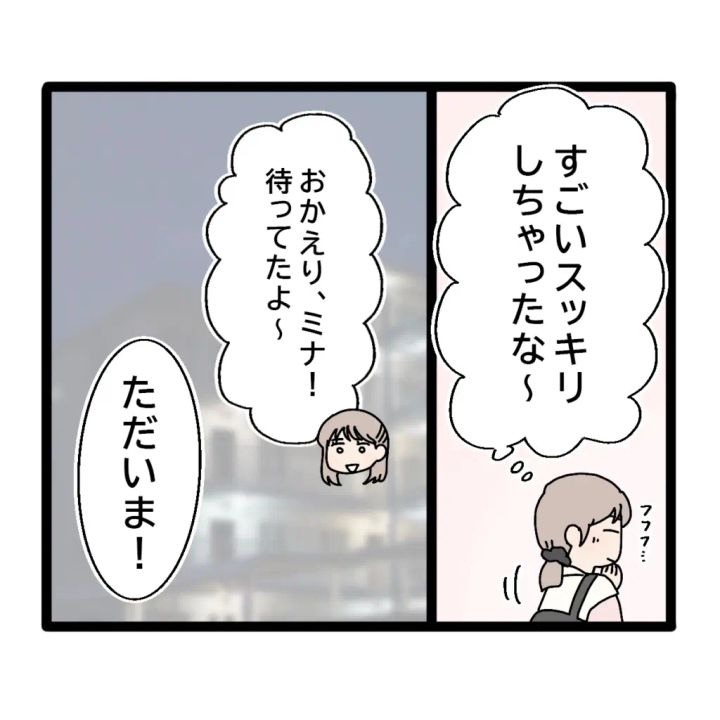 「すごいスッキリしちゃったな~。フフフ」実家に向かいながら、思わず笑みがこぼれる私。そして、「おかえりミナ!待ってたよ~」優しく出迎えてくれるお姉ちゃんに、「ただいま!」と挨拶しました。