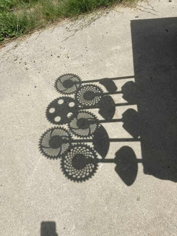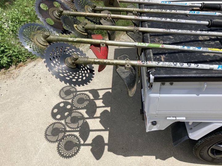 地面に映ったさまざまな柄のひまわり。どうやってできた影かと思えば、なんと草刈り機が作っていました!日ごろ使っている道具から、かわいいひまわり畑が現れるなんて素敵。写真に写っているだけでも3種類の刃があり、草刈り機への興味が湧きました。