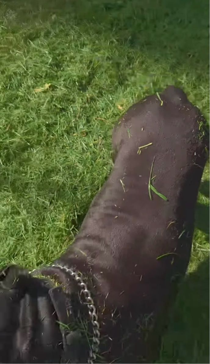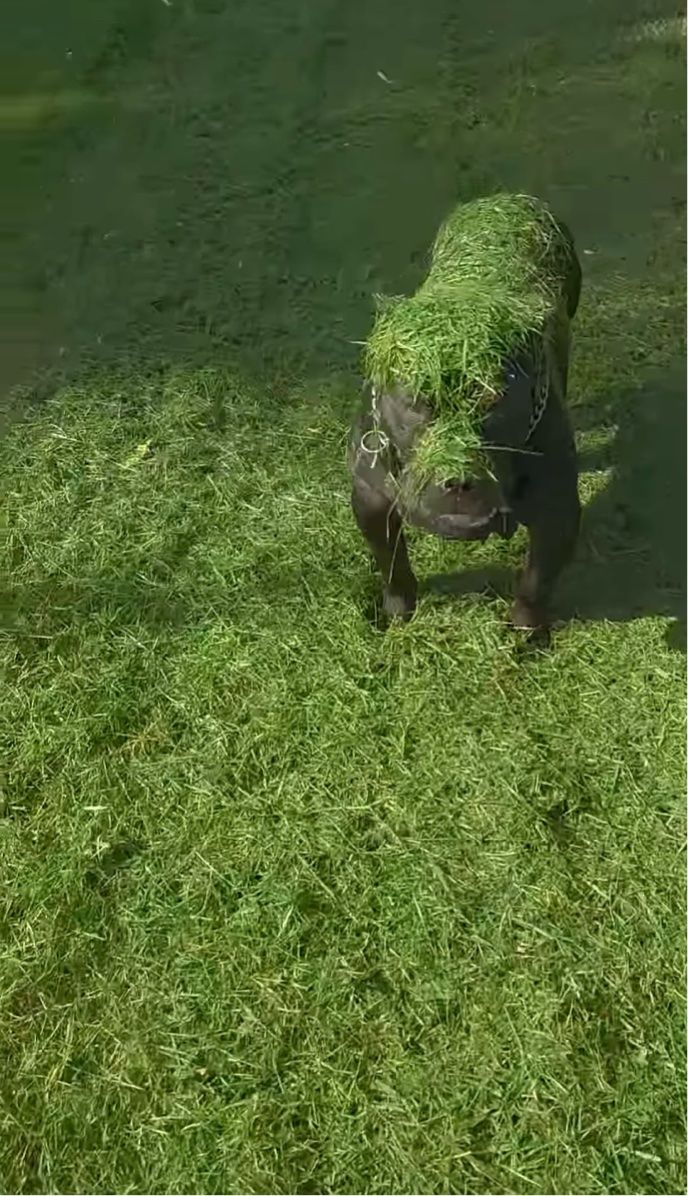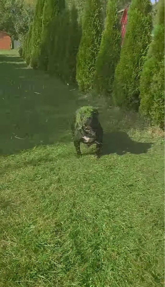 どうやら、草刈り機から飛んでくる草が全身を覆っていたようですね。 黒い毛並みがすっかり緑色になり、周囲と同化してしまっています。