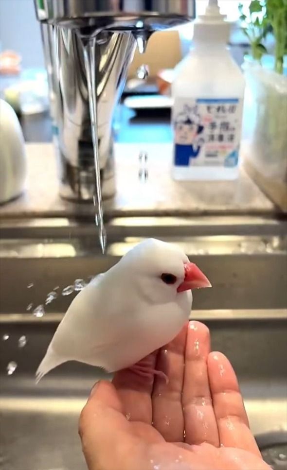 8歳半の文鳥の日頃のお手入れの成果!?若々しい撥水力が話題に「シリコンが塗布してありそうな撥水力!」