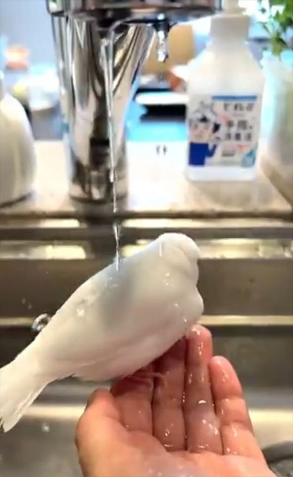 水道からの水を浴びているこの白文鳥の名前は『八千代さん』。 8歳半と高齢だそうですが、水を弾いているその姿はそれを感じさせません!