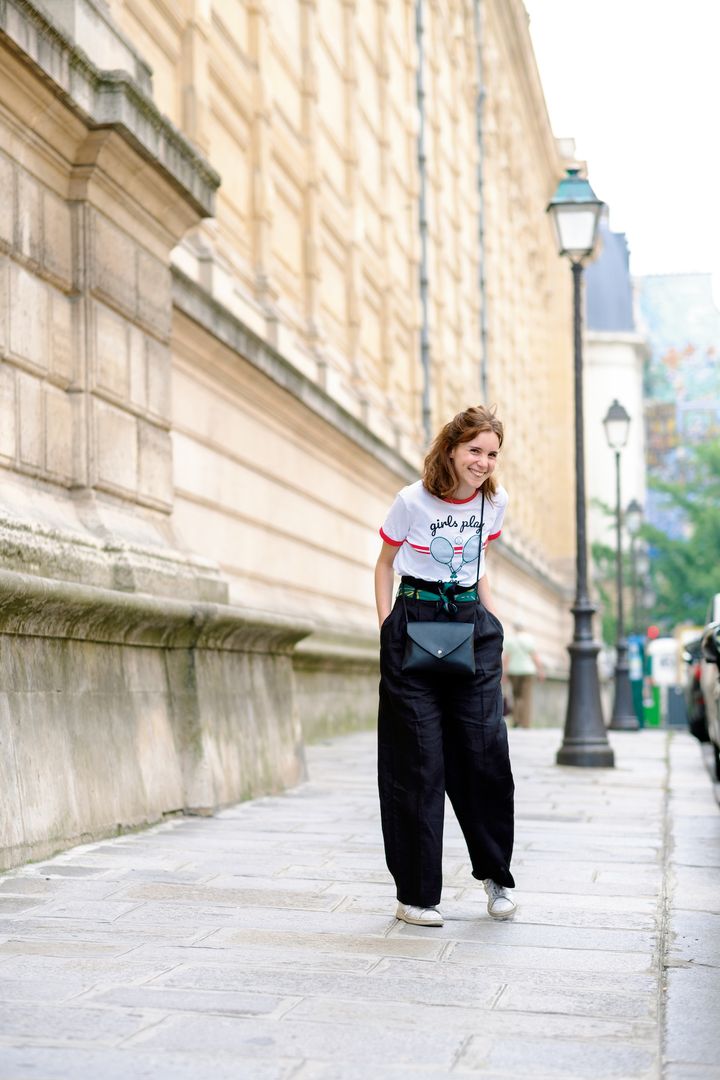 トリムTシャツ×ワイドパンツのボーイッシュなスタイルを、ウエストにひと巻きしたスカーフでほんのり女性らしくまとめ上げる。小物を上手に使ったアイデアが遊び心のある装いへ導く。