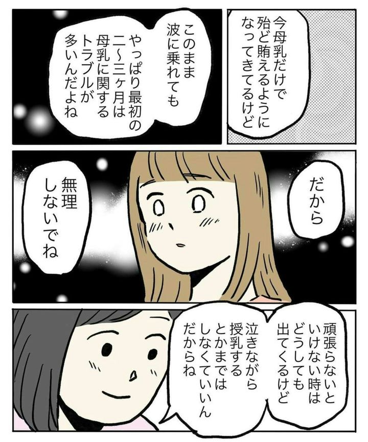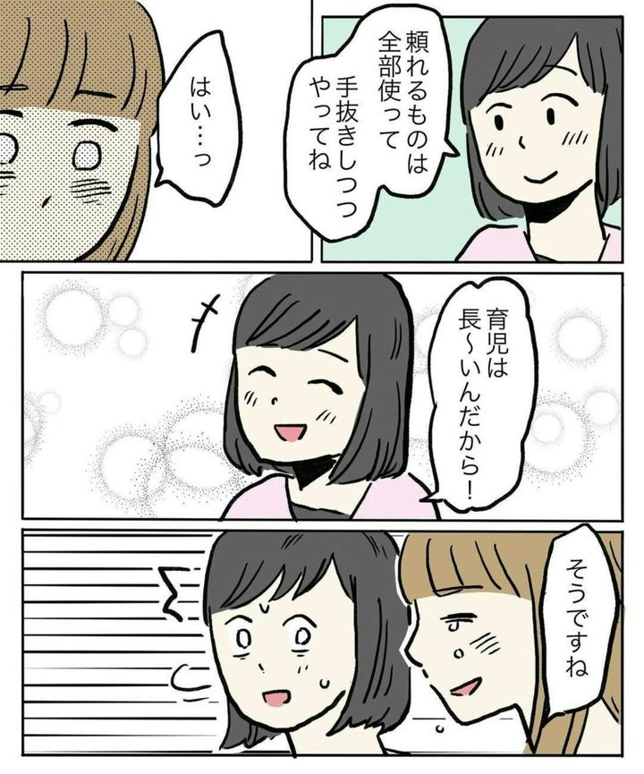 助産師さんの言葉が心にしみますね…。育児はこれから、長く続きます。そして、がんばらなければいけない場面も多々ありますよね。だからこそ、ムリをしないよう、意識的に「手抜き」を心がけることも必要なのかもしれませんね。