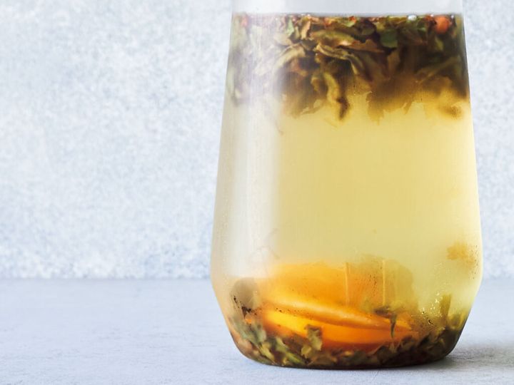 (1)水出し茶用のボトルなどに茶葉とみかん、ぶどう山椒を順に入れて水500mlを注ぎ、冷蔵庫で6~12時間置く。