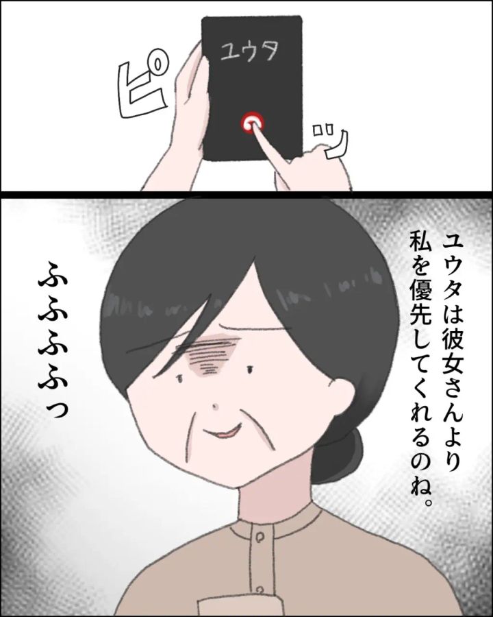 カナコさんの夫ユウタさんは、どんな時でも義母からの電話を優先します。息子ショウくんの運動会でも、義母との電話でショウくんの出番を見逃してしまうユウタさんにカナコさんはモヤモヤ。ユウタさんは結婚前から、デート中によく電話がかかってきて「仕事」と言って席を立っていましたが、実はそれは義母からの電話だったと結婚後に知ったカナコさん。結婚後も二人の時間よりも義母との電話を優先するユウタさんに不満をぶつけますが、ワガママだと逆ギレされてしまいます。義母が電話をかけてくるタイミングが自分とユウタさんが二人のときだと気付いたカナコさんは、翌日の夜からユウタさんと義母がテレビ通話をするときに自分も画面に映りわざと義母に話しかけていましたが「いい加減にしてよ!」とユウタさんにブチギレられます。カナコさんが「お義母さんとゴハン食べてる時に私が電話してきたらどうする?」と聞くと、ユウタさんは「後回しにするよ」とさらり。自分が我慢すればいいと諦めの気持ちが大きくなったカナコさんは、その日から義母の電話を優先するユウタさんに何も言わなくなりました。一方、ユウタさんとの電話にカナコさんが入ってくることを腹立たしく思っていた義母。夫を亡くしてからユウタさんと二人で支え合って生きてきた義母は、ユウタさんが社会人になり家を出ると寂しさを募らせますが「いつでも好きな時に電話してきてもいいよ!」と言ってくれ毎日の電話を楽しみにしていました。その後、ユウタさんから「付き合ってる人がいる」と知らせをもらった義母は、「私がこんなに寂しい思いをしているのに、彼女はユウタと楽しい時間を過ごしているなんて」とイライラ。そんなとき、義母はあることを思いつきます。