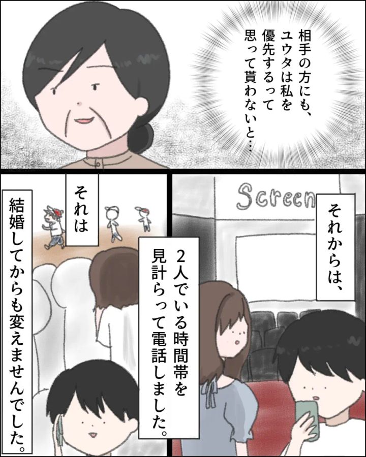 ユウタさんが一日の予定を教えてくれるのをいい事に、わざわざカナコさんと2人でいる時間に電話して自分を優先させ、優越感に浸る義母。結婚後も続くこの行動に、カナコさんから注意されたユウタさんは義母に相談。優しいユウタさんの言葉に、「ユウタは私の味方なの」とまたまた優越感を感じる義母は、ただただ子離れができていない母親のように見えますよね。